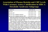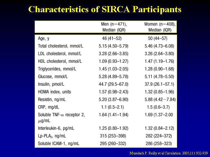 humans. METHODS AND RESULTS: We examined whether plasma resistin levels were associated with metabolic and inflammatory markers, as well as with coronary artery calcification (CAC), a quantitative index of atherosclerosis, in 879 asymptomatic subjects in the Study of Inherited Risk of Coronary Atherosclerosis. Resistin levels were positively associated with levels of inflammatory markers, including soluble tumor necrosis factor-alpha receptor-2 (P<0.001), interleukin-6 (P=0.04), and lipoprotein-associated phospholipase A2 (P=0.002), but not measures of insulin resistance in multivariable analysis. Resistin levels also were associated (odds ratio and 95% confidence interval in ordinal regression) with increasing CAC after adjustment for age, sex, and established risk factors (OR, 1.23 [CI, 1.03 to 1.52], P=0.03) and further control for metabolic syndrome and plasma C-reactive protein (CRP) levels (OR, 1.25 [CI, 1.04 to 1.50], P=0.01). In subjects with metabolic syndrome, resistin levels further predicted CAC, whereas CRP levels did not. CONCLUSIONS: Plasma resistin levels are correlated with markers of inflammation and are predictive of coronary atherosclerosis in humans, independent of CRP. Resistin may represent a novel link between metabolic signals, inflammation, and atherosclerosis. Further studies are needed to define the relationship of resistin to clinical cardiovascular disease. |