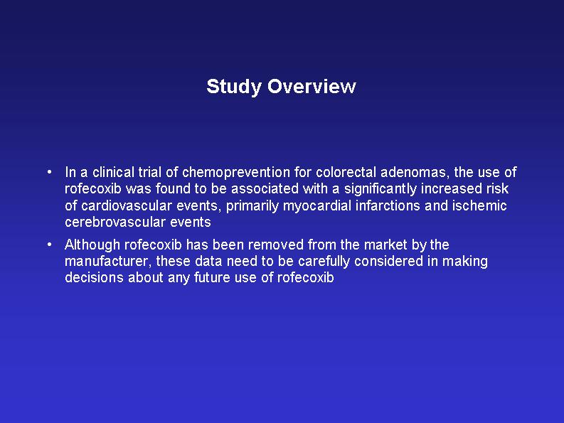 with a history of colorectal adenomas. METHODS: A total of 2586 patients with a history of colorectal adenomas underwent randomization: 1287 were assigned to receive 25 mg of rofecoxib daily, and 1299 to receive placebo. All investigator-reported serious adverse events that represented potential thrombotic cardiovascular events were adjudicated in a blinded fashion by an external committee. RESULTS: A total of 46 patients in the rofecoxib group had a confirmed thrombotic event during 3059 patient-years of follow-up (1.50 events per 100 patient-years), as compared with 26 patients in the placebo group during 3327 patient-years of follow-up (0.78 event per 100 patient-years); the corresponding relative risk was 1.92 (95 percent confidence interval, 1.19 to 3.11; P=0.008). The increased relative risk became apparent after 18 months of treatment; during the first 18 months, the event rates were similar in the two groups. The results primarily reflect a greater number of myocardial infarctions and ischemic cerebrovascular events in the rofecoxib group. There was earlier separation (at approximately five months) between groups in the incidence of nonadjudicated investigator-reported congestive heart failure, pulmonary edema, or cardiac failure (hazard ratio for the comparison of the rofecoxib group with the placebo group, 4.61; 95 percent confidence interval, 1.50 to 18.83). Overall and cardiovascular mortality was similar in the two groups. CONCLUSIONS: Among patients with a history of colorectal adenomas, the use of rofecoxib was associated with an increased cardiovascular risk. |