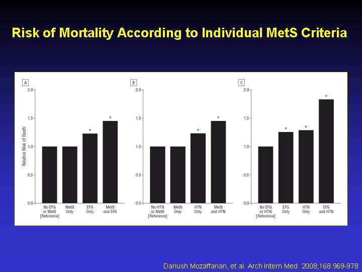 BACKGROUND: The utility of metabolic syndrome (MetS) for predicting mortality among older adults, the highest-risk population, is not well established. In addition, few studies have compared the predictive utility of MetS to that of its individual risk factors. METHODS: We evaluated relationships of MetS (as defined by the National Cholesterol Education Program Expert Panel on Detection, Evaluation, and Treatment of High Blood Cholesterol in Adults [Adult Treatment Panel III (ATPIII)], International Diabetes Foundation [IDF], and World Health Organization [WHO]) and individual MetS criteria with mortality between 1989 and 2004 among 4258 US adults 65 years or older and free of prevalent cardiovascular disease (CVD) in the Cardiovascular Health Study, a multicenter, population-based, prospective cohort. Total, CVD, and non-CVD mortality were evaluated. Cox proportional hazards models were used to estimate the mortality hazard ratio (relative risk [RR]) predicted by MetS. RESULTS: At baseline (mean age, 73 years), 31% of men and 38% of women had MetS (ATPIII). During 15 years of follow-up, 2116 deaths occurred. After multivariable adjustment, compared with persons without MetS, those with MetS had a 22% higher mortality (RR, 1.22; 95% confidence interval [CI], 1.11-1.34). Higher risk with MetS was confined to persons having elevated fasting glucose level (EFG) (defined as > or = 110 mg/dL [> or = 6.1 mmol/L] or treated diabetes mellitus) (RR, 1.41; 95% CI, 1.27-1.57) or hypertension (RR, 1.26; 95% CI, 1.15-1.39) as one of the criteria; persons having MetS without EFG (RR, 0.97; 95% CI, 0.85-1.11) or MetS without hypertension (RR, 0.92; 95% CI, 0.71-1.19) did not have higher risk. Evaluating MetS criteria individually, we found that only hypertension and EFG predicted higher mortality; persons having both hypertension and EFG had 82% higher mortality (RR, 1.82; 95% CI, 1.58-109). Substantially higher proportions of deaths were attributable to EFG and hypertension (population attributable risk fraction [PAR%], 22.2%) than to MetS (PAR%, 6.3%). Results were similar when we used WHO or IDF criteria, when we evaluated different cut points of each individual criterion, and when we evaluated CVD mortality. CONCLUSION: These findings suggest limited utility of MetS for predicting total or CVD mortality in older adults compared with assessment of fasting glucose and blood pressure alone.